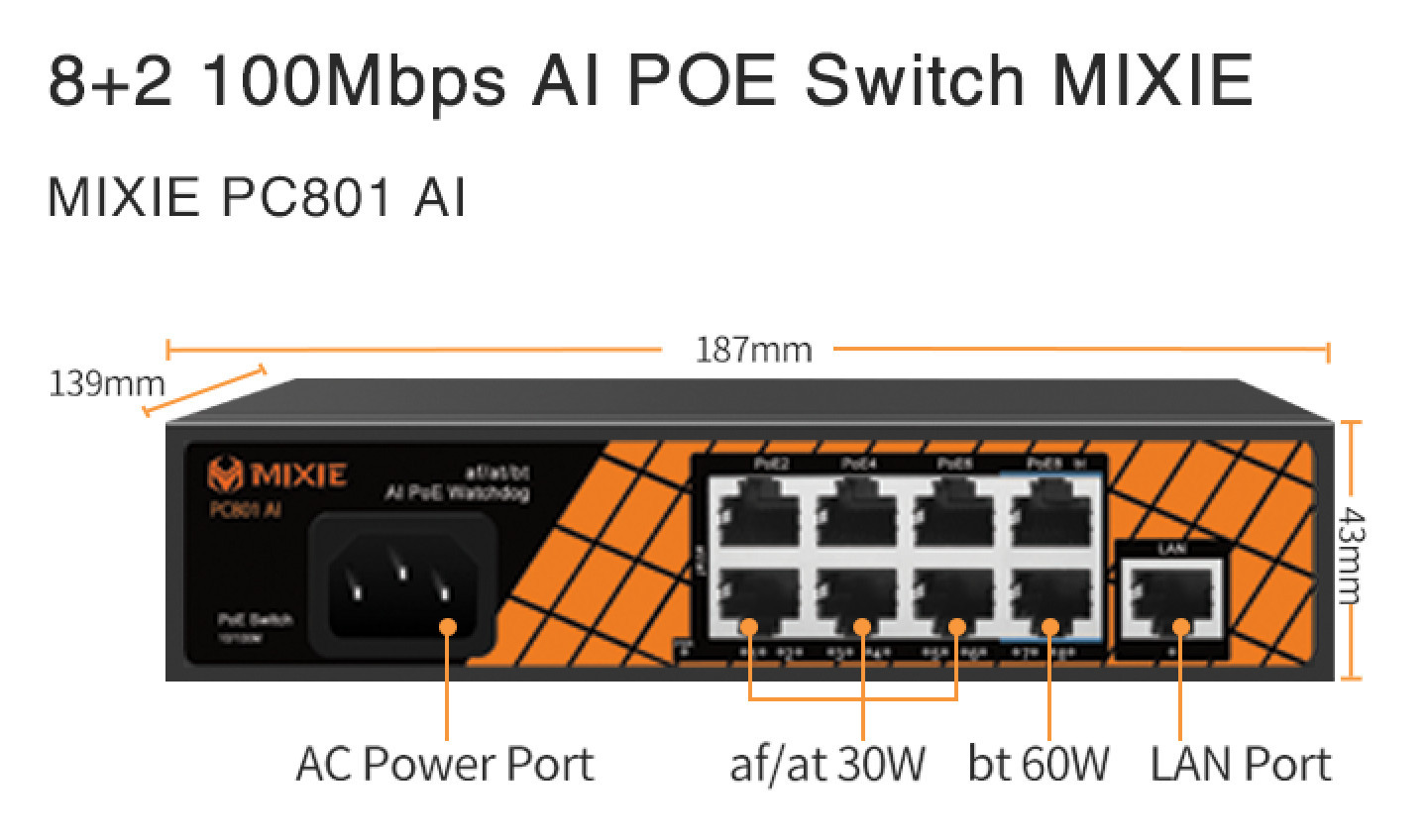 Switch POE MIXIE PC801 8+1 (100Mbs), Tối đa 250M, Watchdog, Chống sét